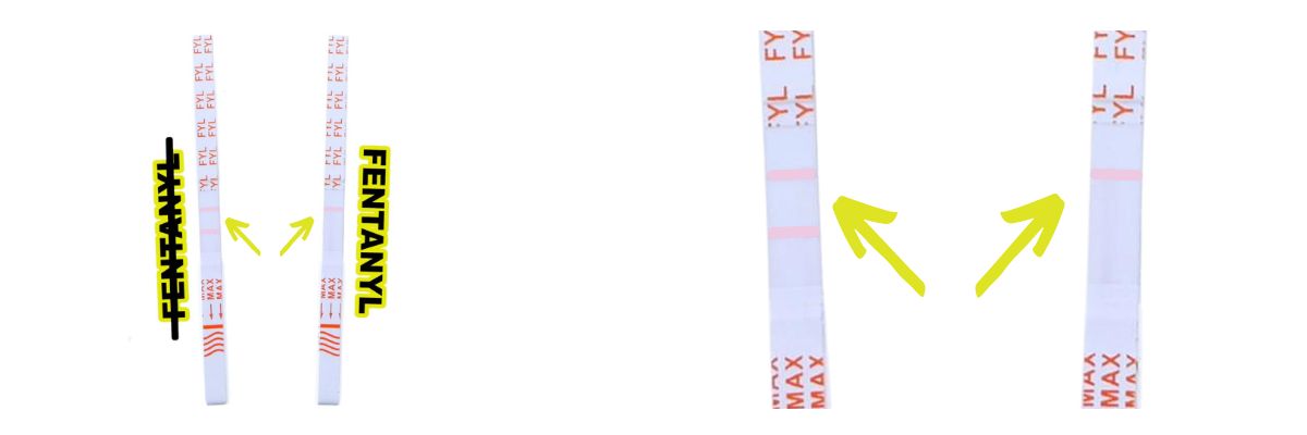 1 čára = fentanyl, 2 čáry = žádný fentanyl. Slabé čáry se také počítají. Výsledky testování fentanylu ignoruj po 5 minutách.