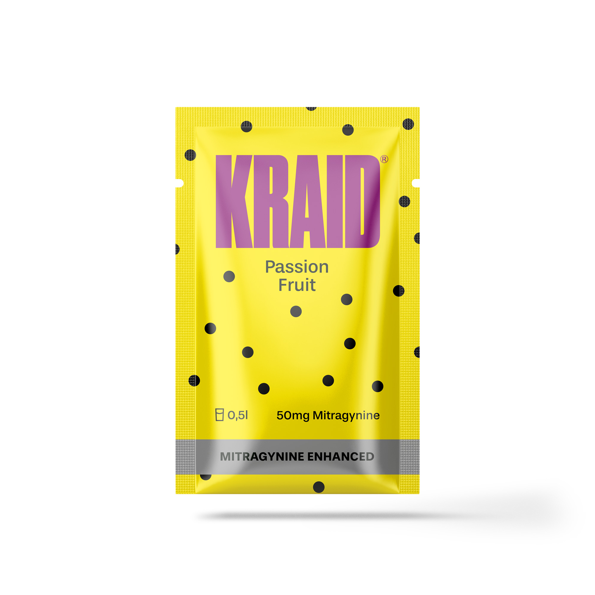 ® obsahuje extrakt z listů kratomu, bohatý na alkaloidy, včetně mitragyninu. Každý sáček KRAID® obsahuje 50 mg mitragyninu, což odpovídá přibližně 4-6 g běžného kratom prášku.
