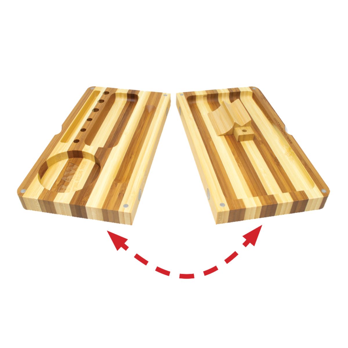 Bambusový Balící Tác RAW – limitovaná edice – vyrobený z přírodního bambusu, ti přináší nejen funkčnost, ale i neotřelý design. Když je zavřený, je tento balící tác perfektní pro uložení kuřáckých potřeb. Ovšem jeho pravý potenciál spatříš, až když ho otevřeš! Díky dvěma ultra silným magnetům se obě poloviny spojí v jeden stabilní balící tác o rozměrech přibližně 22 x 23,5 x 2 cm.