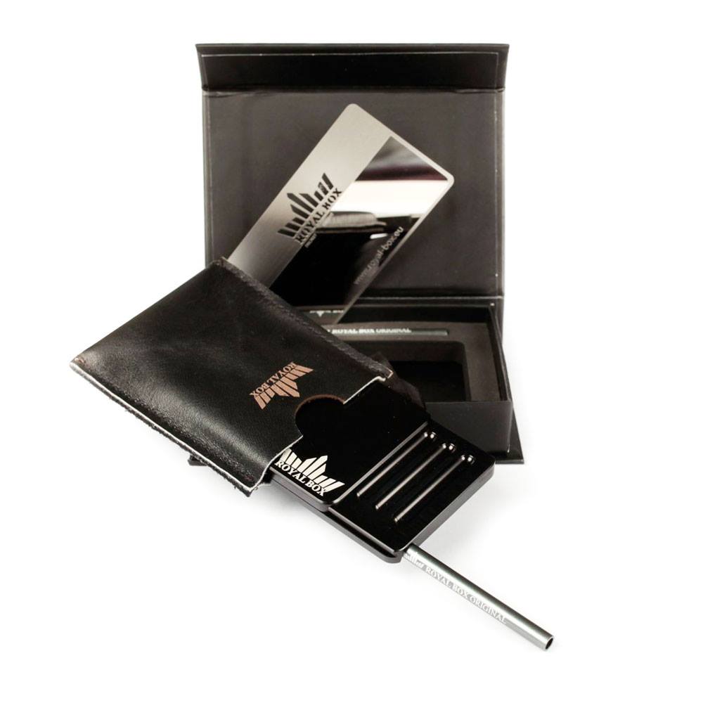 Royal Box je speciálně vytvořen pro lidi, kteří hledají elegantní a praktické řešení. Jedná se o jedinečný sběratelský kousek vyrobený ve velmi odolném provedení matného hliníku nejvyšší kvality. Účel produktů je univerzální. Kompaktní velikost produktu a jeho rozměry jsou navrženy tak, aby se vešly do jakékoliv peněženky, či kapsy, stejně jako kreditní karta (86 mm x 54 mm x 8 mm). Balení obsahuje: luxusní dárkovou krabičku, kožené pouzdro, 2x hliníkovou trubičku, zrcátko Royal Box.