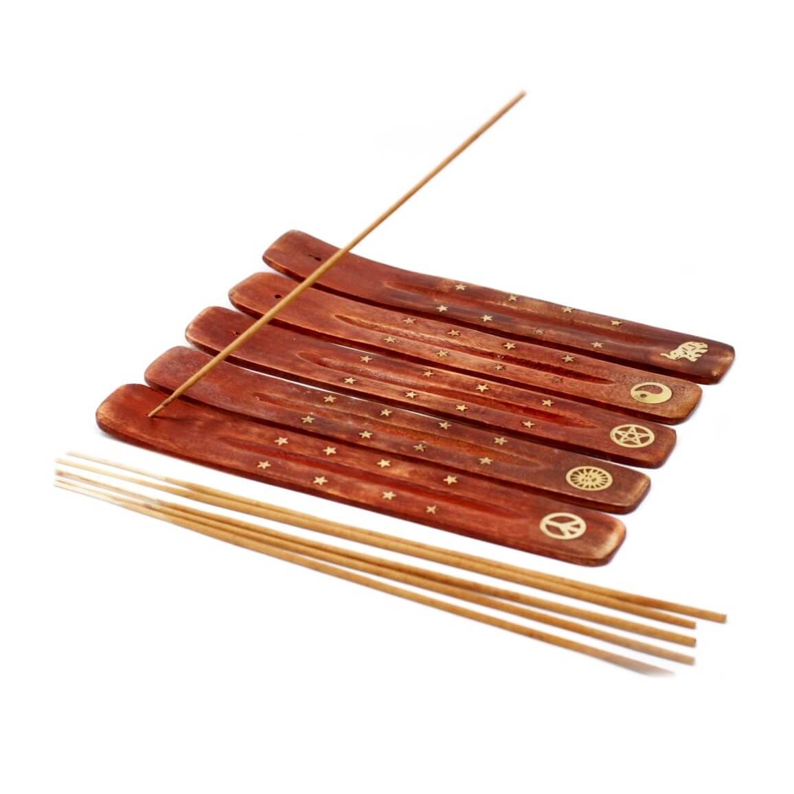 Tradiční indický stojánek na vonné tyčinky. Stojánek je vyroben ze dřeva a je ozdoben krásnými mosaznými hvězdičkami a slonem. Hvězdičky lemují prohlubeň pro padající popel a silueta slona je umístěna ve spodní části stojánku.