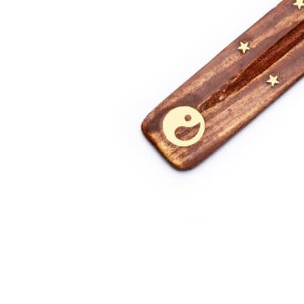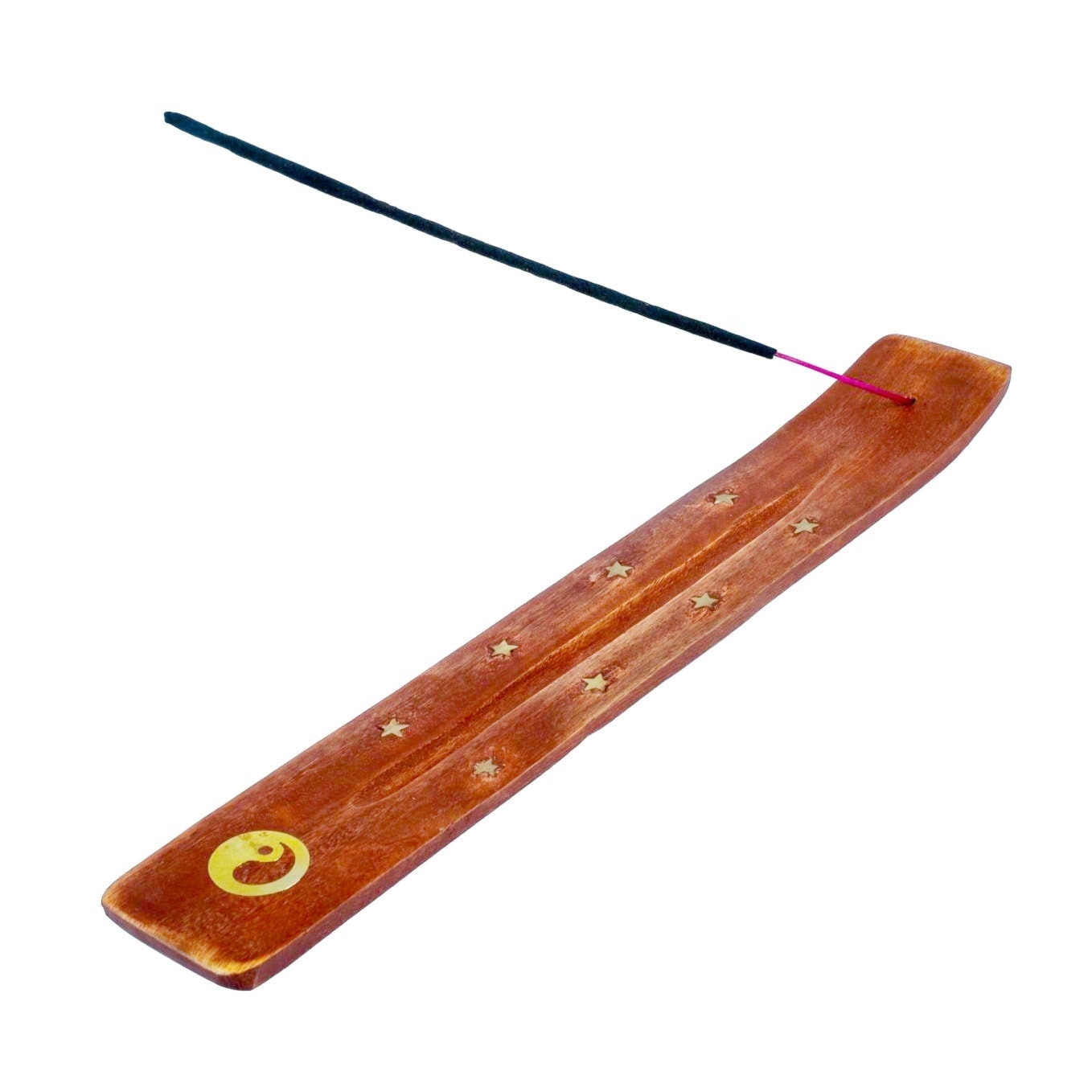 Tradiční indický stojánek na vonné tyčinky. Stojánek je vyroben ze dřeva a je ozdoben krásnými mosaznými hvězdičkami a vzorem Yin Yang. Hvězdičky lemují prohlubeň pro padající popel a silueta Yin Yang je umístěna ve spodní části stojánku.